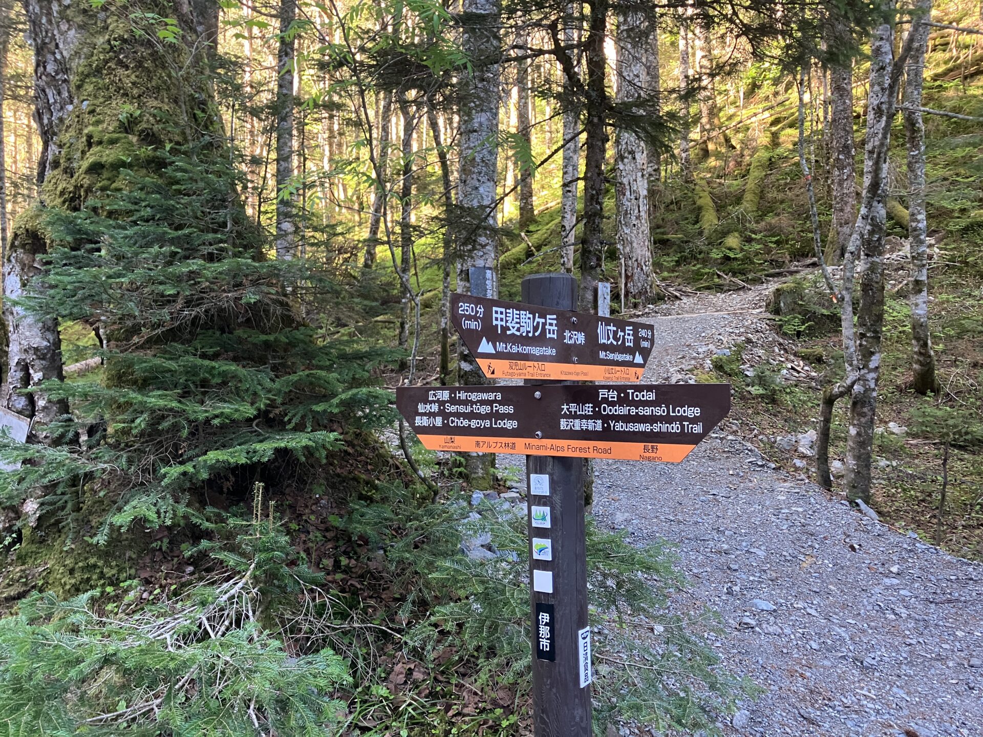 ここが、甲斐駒方面と仙水峠への分岐路。甲斐駒ヶ岳が綺麗に見えます。