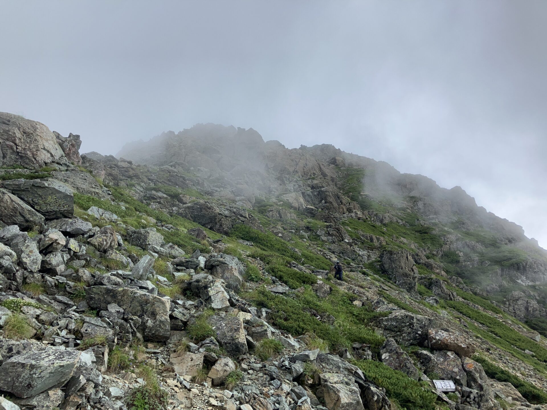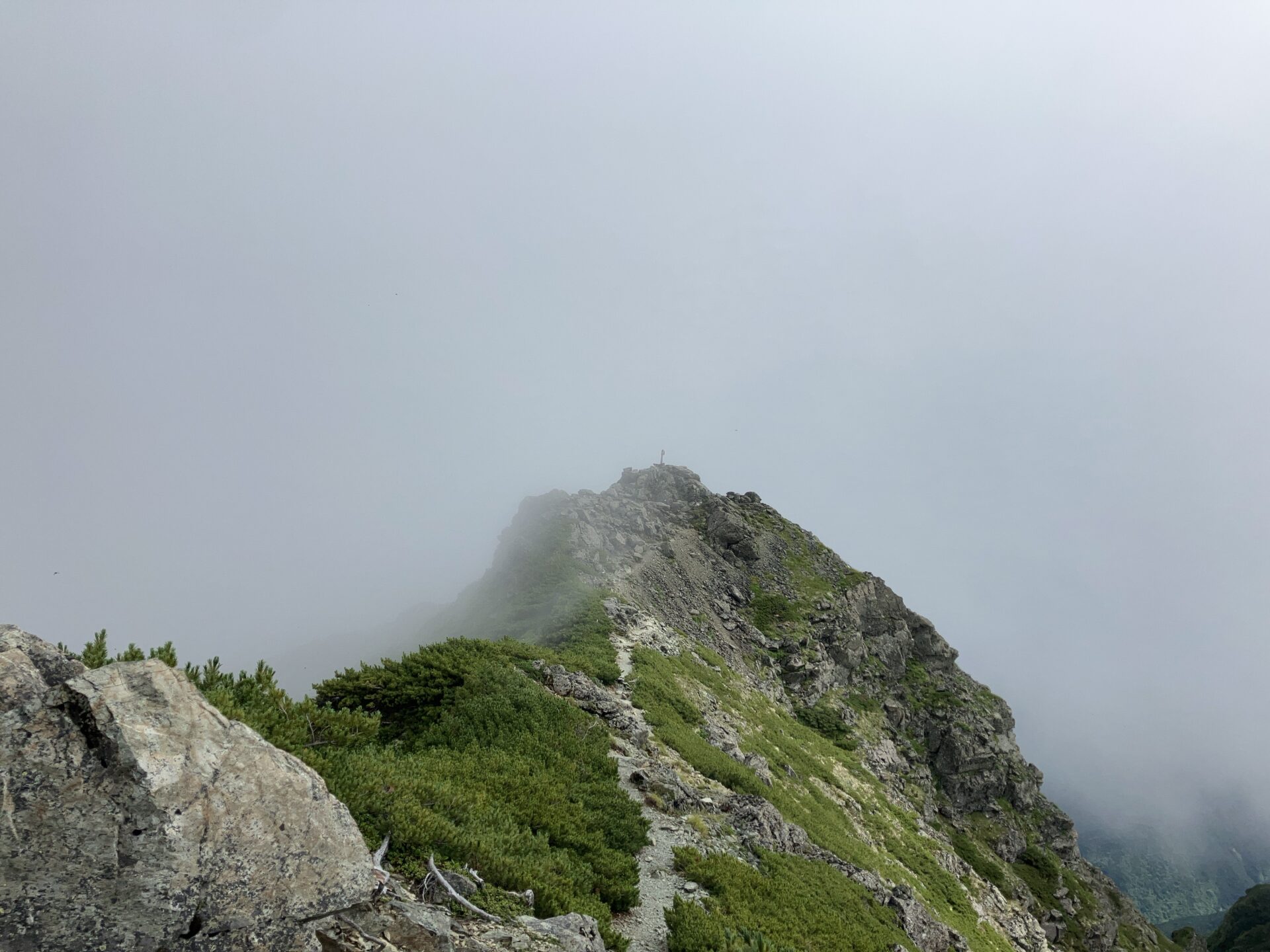鎖場を登り切り、ガスの向こうに見える目印が山頂。