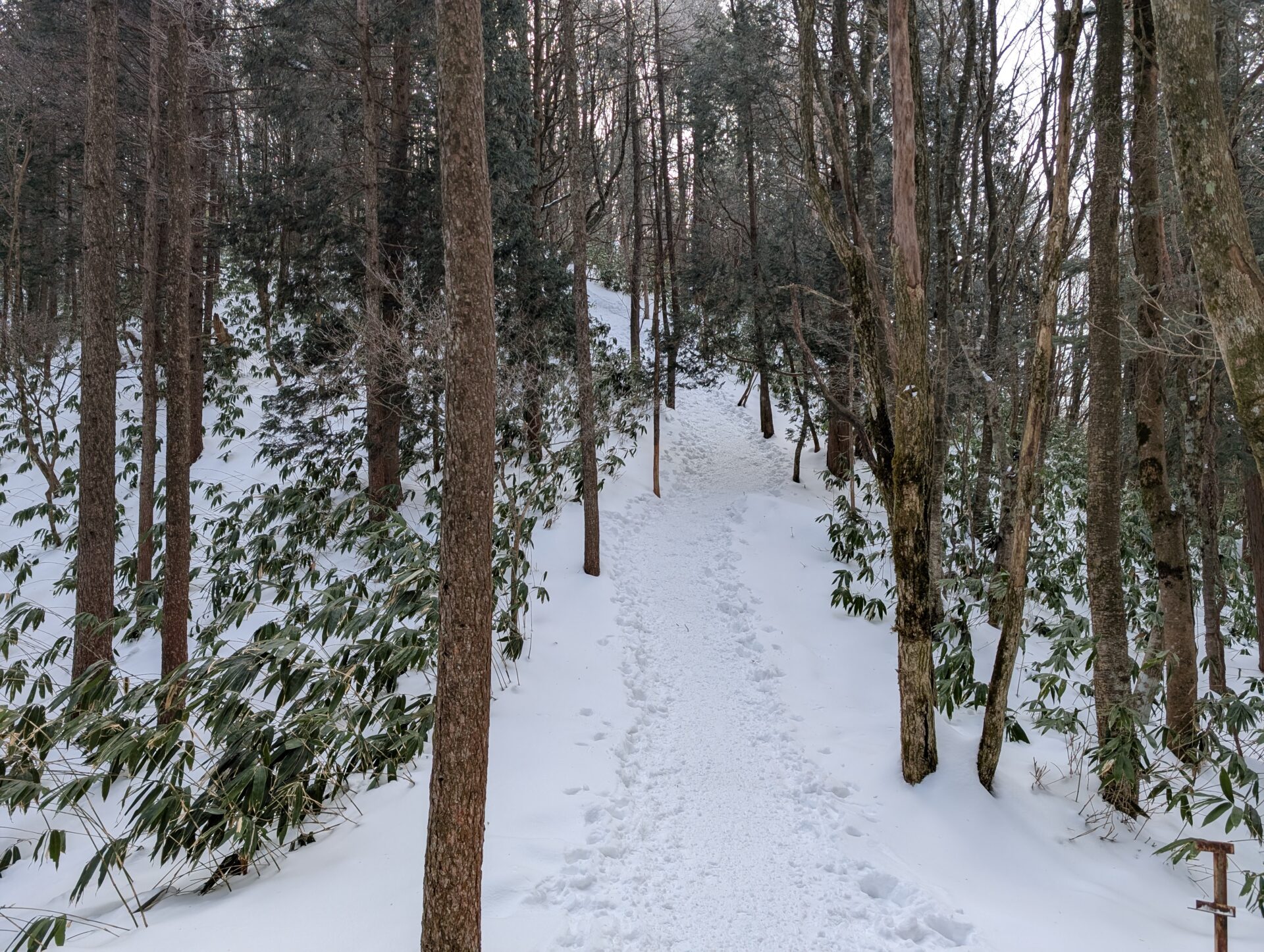 道中は真っ白です。雪道も良く踏み固められており踏み抜きは殆どありません。