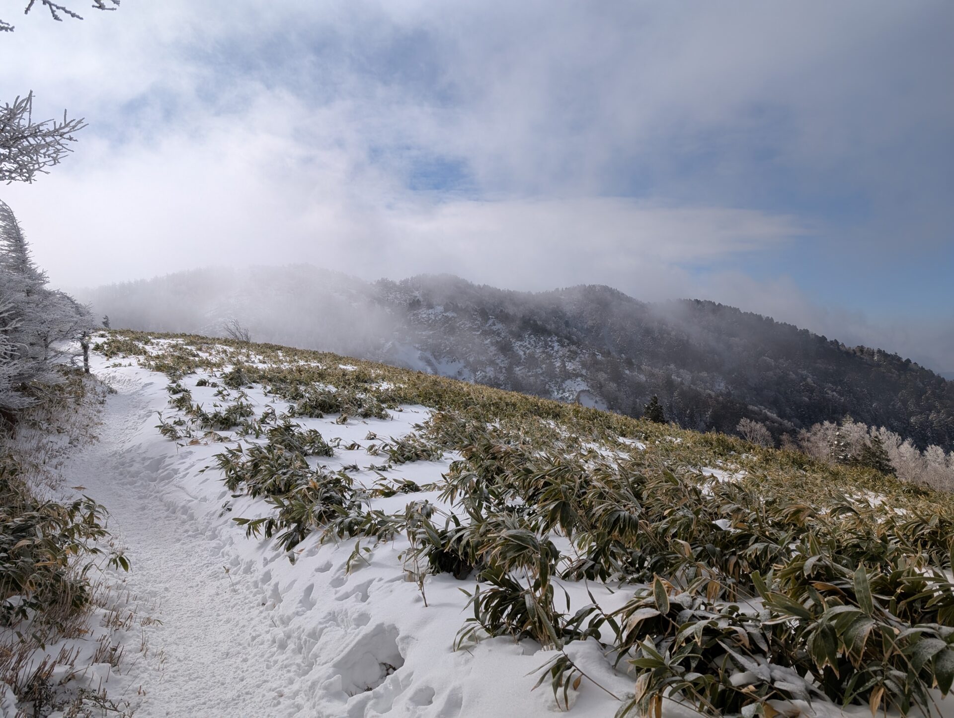 所々の急登はツボ足で歩くのは難しいので雪山装備は必須です。