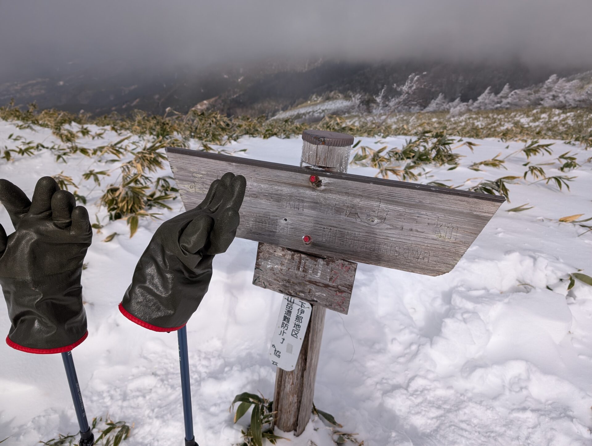 山頂に到着。吹き溜まりになっているのか山頂周辺だけ積雪が深かったです。