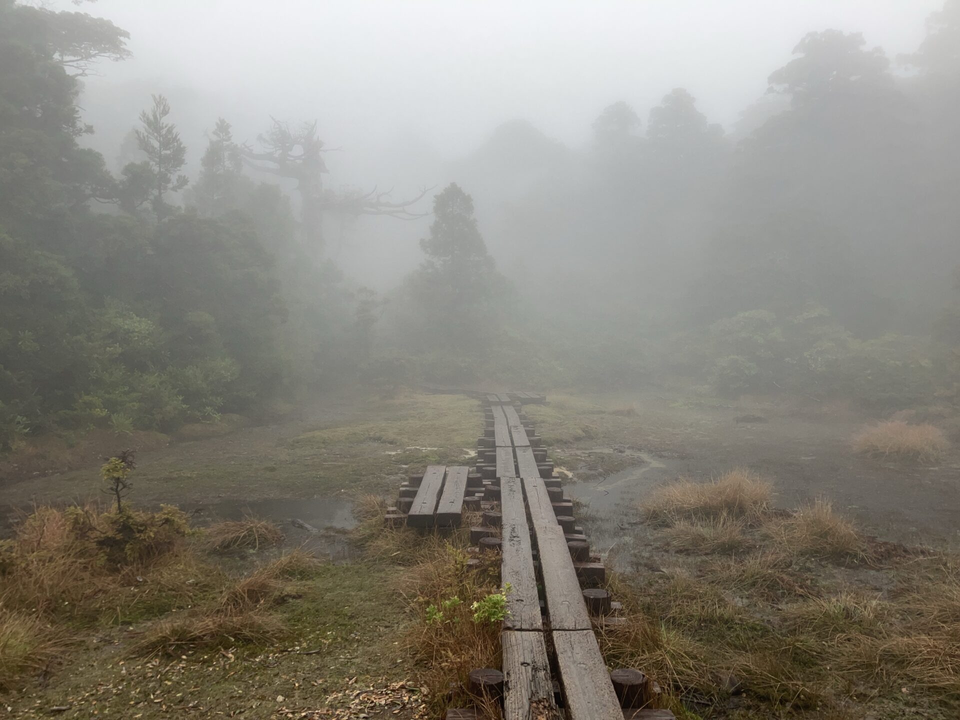 ガスの中を延々と歩き続けました。木道が水を吸って滑りやすくなっていました。